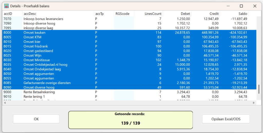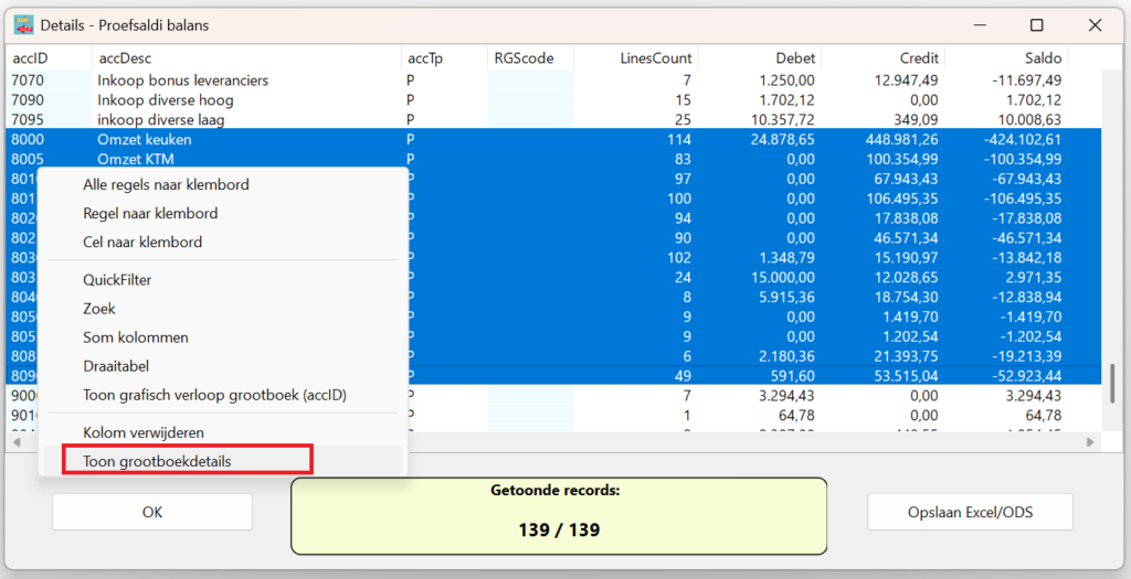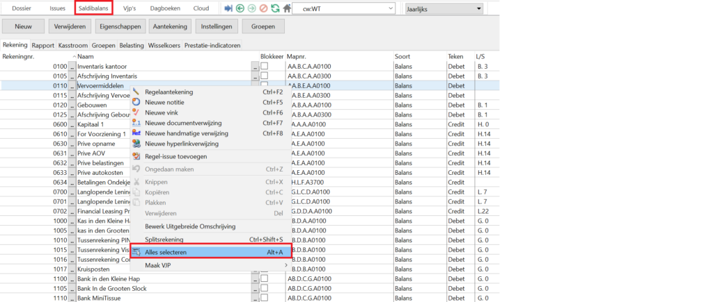 Ga naar saldibalans. Vervolgens rechtermuisklik (Alles selecteren) en vervolgens Kopiëren. Plak alles in een Excel bestand: