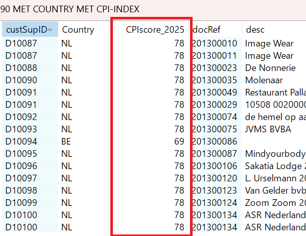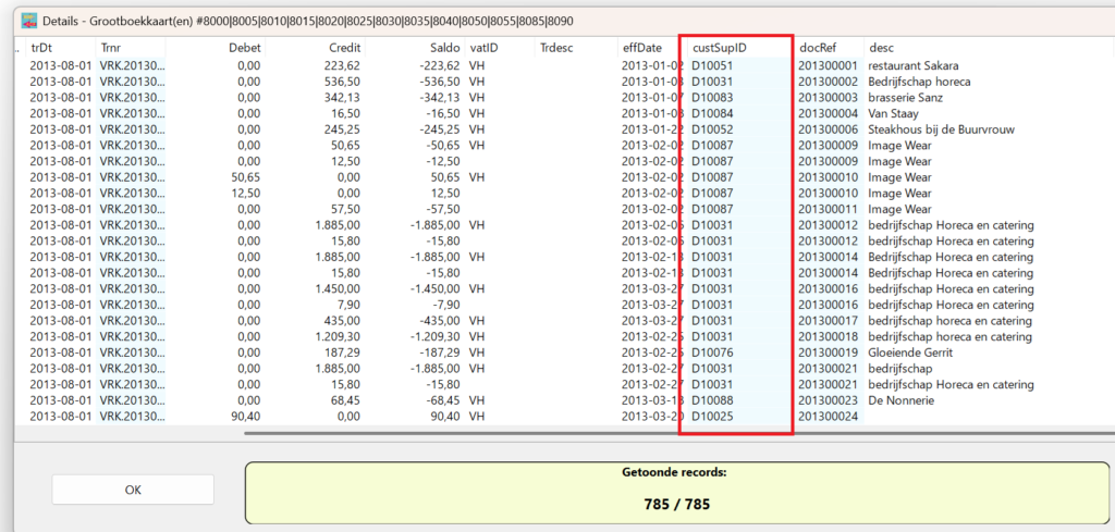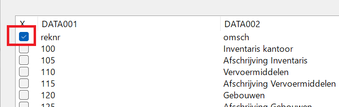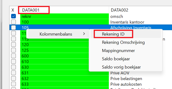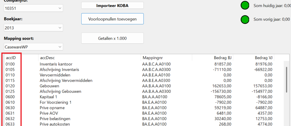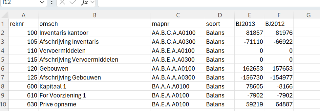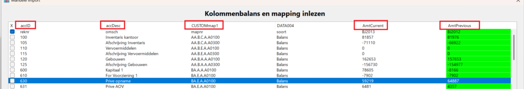 accID→ rekeningnummeraccDesc→ omschrijvingCUSTOMmap1→ mappingAmtCurrent→ huidig jaarAmtPrevious→ vorig jaar