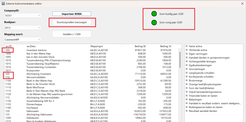 In dit geval zien we dat de voorloopnullen zijn weggevallen terwijl die zo wel in de auditfile zelf staan. Om te zorgen dat deze rekeningen correct worden gematched gaan we de voorloopnullen toevoegen.