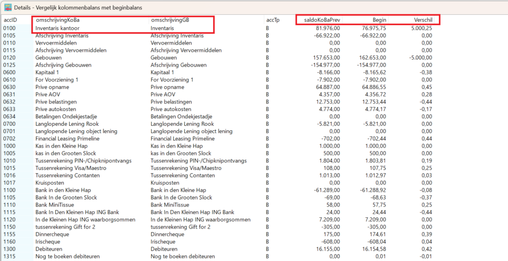 In overzicht kun je snel zien waar er waar er afwijkingen zitten tussen beginstanden en de eindbalans van het voorgaande jaar. Ook kun je afwijkende omschrijvingen zien.