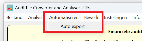 Vanaf versie 2.15 is er ook een menu ‘automatiseren’ bijgekomen. Het doel is om makkelijk op basis ingelezen auditfile standaard sets te exporteren. Thans werkt dit voor financiĆ«le auditfiles, maar dit zal ook in de toekomst beschikbaar komen voor de andersoortige auditfiles.