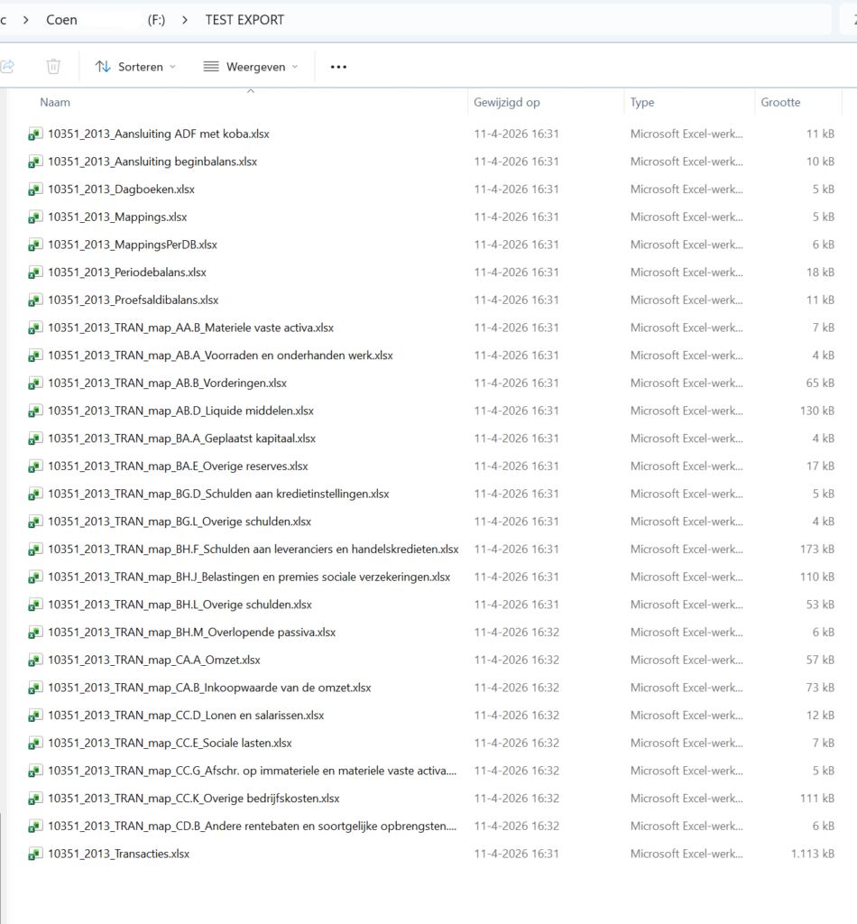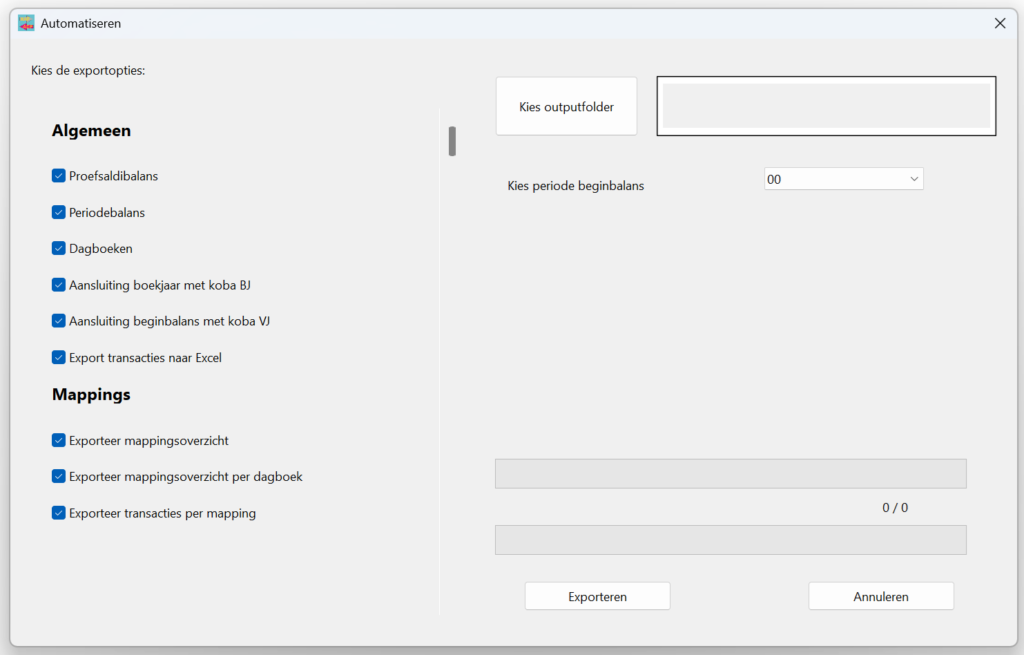 Aan de linkerkant kun je exports aan of uitzetten welke uitgevoerd moeten worden (deze instellingen worden voor volgende exports bewaard). Met ‘Exporteer transacties per mapping’ krijg je datasets per jaarrekeningpost.